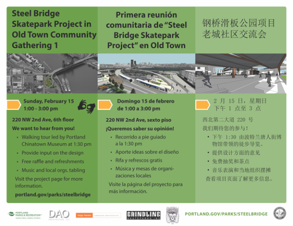 For more information about the event, please visit: Steel Bridge Skatepark Project in Old Town Community Gathering 1 | Portland.gov